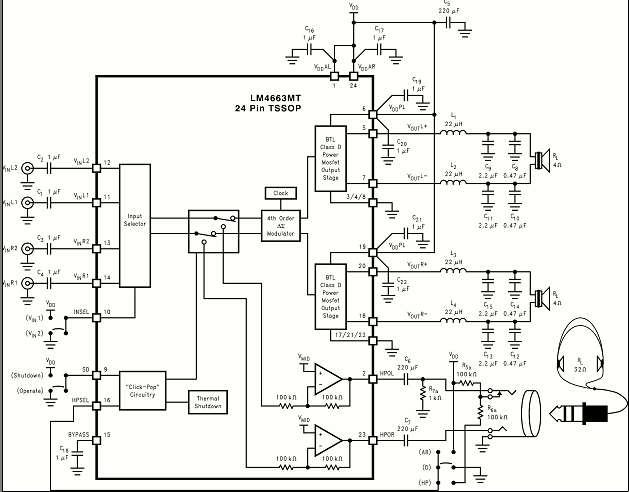 Two stereo input selector, Micropower shutdown mode, Stereo headphone amplifier, no heatsink needed, “Click and pop” suppression circuitry, Delta-sigma modulator, high efficiency, single supply. Component : resistor, capacitor, LM4663, speaker, headphone.